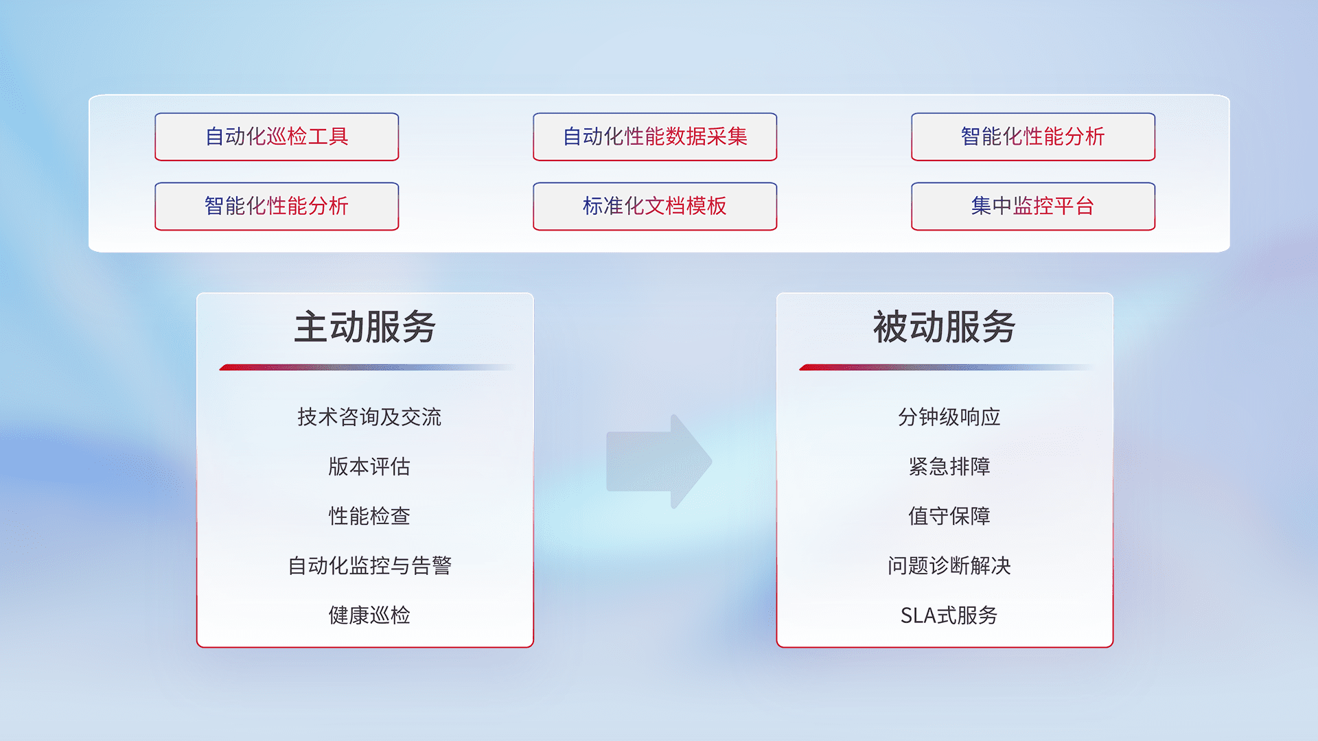 智能化工具和标准化文档,,,,保障服务质量,,,,提供主动服务(包含技术咨询、、版本评估、、、、性能检查、、、、自动化监控与告警、、、、健康巡检)和被动服务包含(分钟级响应、、、紧急排障、、值守保障、、、、问题诊断解决、、、、SLA服务)。。。。